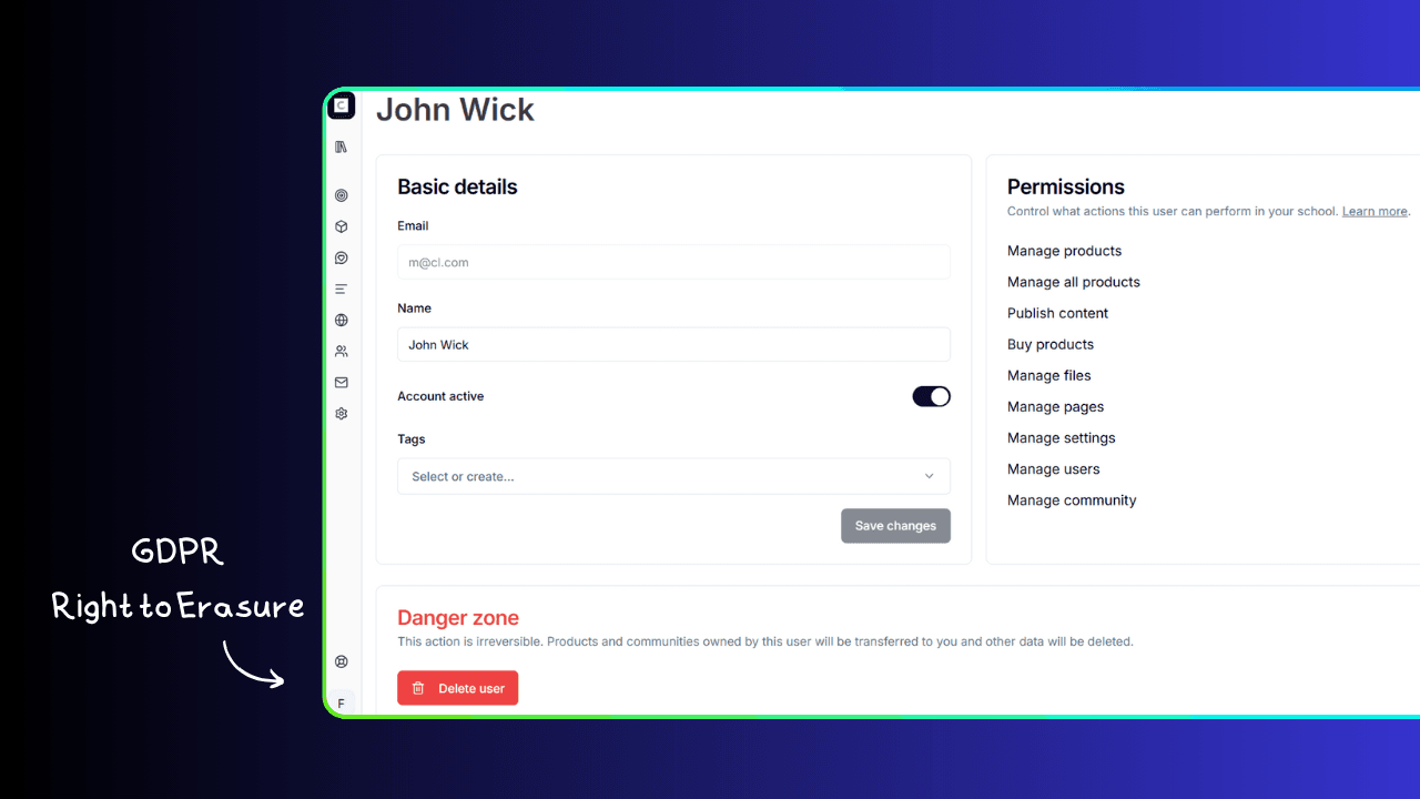 Admins can now remove users securely. All business entities owned by the deleted user are reassigned to the admin performing the action, while personal data is purged to support future compliance work.